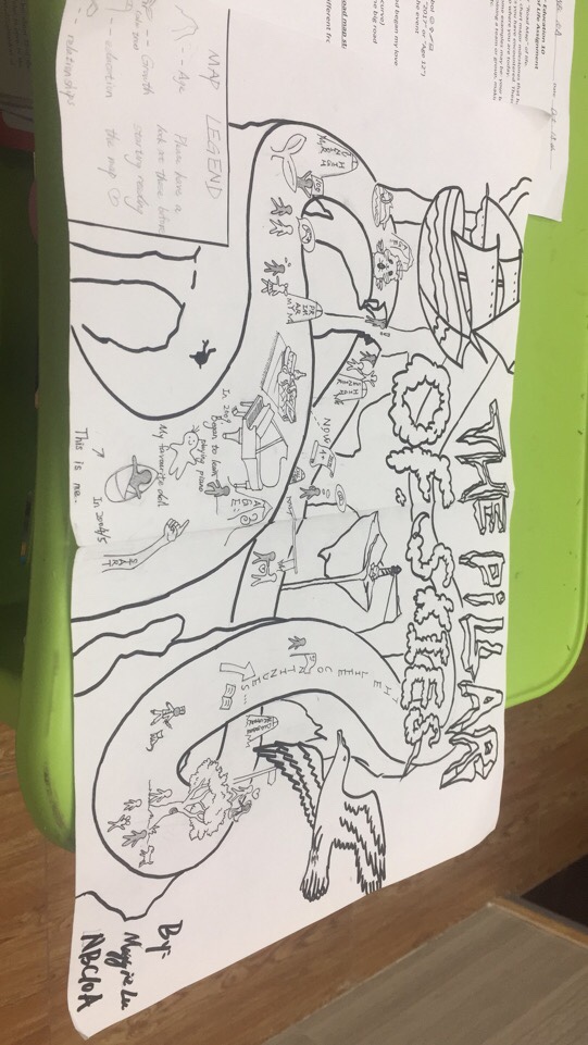 「In our Career-Life Classes, we designed a “road map of life”. It is a special kind of painting showing our experiences in the past few decades. At first, I made a sketch of the zigzagged shape of the road. Then, I made some changes to it in order to make the picture look more symmetric and appropriate. After that, I chose some of my most precious events in life and arranged them in chronicle order. As the criteria of this project suggests us that adding some extras such as legends to our map would possibly led to a higher score, I used different kinds of signs including stone carvings, mile stones, signposts as well as plant sprouts & trees to show different meanings of these life-influencing things.」
